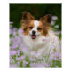 Un chien de Papillon blanc et rouge assis dans une prairie entourée de Cuckooflower. Le Papillon est une race de jouets alerte, amicale et très intelligente. Ce charmant petit chien a été photographié par Katho Menden, cette photo d'animal sur une affiche est une idée de cadeau enchanteresse pour les amateurs de dogloire.