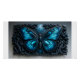 Une oeuvre d'art en céramique à couper le souffle présentée sous forme de sculpture détaillée, de tuiles en relief complexes ou de poteries superbement peintes. Le sujet central est un grand papillon mystique aux ailes expansives qui brille dans des bleus profonds, des noirs et des dents lumineuses. Ses motifs complexes sont définis par de fines lignes incisées, des techniques d'incision de sgraffito ou de mishima, tandis que les glaçures cristallines, irisées et translucides créent une lueur bioluminescente frappante. Le corps sculpté est détaillé avec la segmentation naturaliste, apportant la présence de la vie à la créature. Autour du papillon, une forêt sombre et enchanteresse émerge en bas relief, avec des arbres et du feuillage en argile texturée et finie par des glaçures mattes de bleu profond, gris et noir. Le mélange subtil de glaçures et les textures de surface évoquent une atmosphère éthérée et brumeuse, ce qui renforce l'interaction spectaculaire de la lumière et de l'ombre. La pièce est à la fois enchanteresse et profonde, une fusion magistrale de détails sculpturaux, de l'art du vernis et de la profondeur narrative.