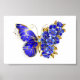 Bijoux, bleu, saphir, papillon aux fleurs pétillantes avec aile décorée de bleu, fleurs précieuses avec feuilles d'or sur arrière - plan blanc.
