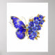 Bijoux, bleu, saphir, papillon aux fleurs pétillantes avec aile décorée de bleu, fleurs précieuses avec feuilles d'or sur arrière - plan blanc.