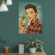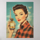 Un poster vintage glamour des années 1950 avec une femme sophistiquée en plaid rouge tenant une luxueuse bouteille de parfum intitulée "PARFUM". La tour Eiffel s'élève dans l'arrière - plan, mettant en valeur l'esthétique chic parisienne avec ses couleurs audacieuses, sa mode rétro et sa beauté classique.