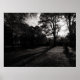 Une photo chaude tonique en noir et blanc prise au milieu des arbres à Bute Park Cardiff lors d'un après-midi ensoleillé de novembre, le soleil d'automne bas dans le ciel brille à travers les arbres jetant de longues ombres et des silhouettes spectaculaires.