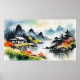 Paysage d'été avec un chalet et des montagnes, style peinture à l'encre chinoise