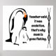 Le père de l'empereur Penguin avec son fils. Les images ont été faites dans un simple stylo noir et orgue. Le pingouin père et le jeune poussin a été fait en ligne noire, et le pingouin adulte mâle a une couleur orange sur son cou. Certes, je ne suis pas vraiment sûr du sexe de la petite fille, ça pourrait être un garçon ou une fille. Sur le côté droit se trouve une frontière noire tribale. Entre la frontière et le pingouin, est un espace vide avec un texte changeant qui dit : "L'enseignant a dit que c'était l'évolution, c'est pourquoi maman est partie à la pêche."