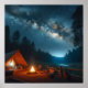 Un camping confortable sous un ciel étoilé dans le désert, avec la Voie Lactée clairement visible.