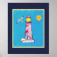 Une affiche sur le thème nautique. Arrière - plan bleu foncé avec cadre bleu clair superposé. À l'intérieur du cadre se trouve un phare rayé rouge et une boule de plage, un soleil souriant et une mouette volante au loin.