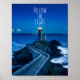 Phare au crépuscule qui clignote son phare dans la mer. Les mots "Suivez la Lumière" sont écrits en blanc.