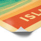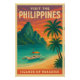 Affiche de voyage rétro des Philippines, mettant en valeur sa beauté tropicale. Au premier plan : plage de sable blanc aux eaux turquoise cristallines, banca traditionnelle (bateau à aube) ancrée près du rivage, palmiers verdoyants se balançant dans la brise. Arrière - plan : des falaises calcaires spectaculaires de Palawan s'élevant au-dessus de l'océan et un ciel radieux couché de soleil avec des teintes orange, rose et violet.