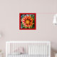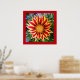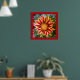 Poster avec la photo d'une fleur rouge et jaune aux couleurs vives avec des feuilles verts et un arrière - plan bleu et vert.