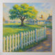 Oeuvre d'un arbre à travers une clôture de piquetage. Un tableau de charme qui évoque la beauté paisible d'une campagne ensoleillée. Une clôture classique blanche de piquetage courbe doucement au premier plan, menant l'oeil vers un grand arbre debout majestueusement dans un champ verdoyant. Au loin, les maisons blanches se nichent confortablement sous un ciel doux et clair, faisant allusion à une communauté tranquille. Rendu avec une touche douce et peinte et une palette harmonieuse de verts doux, de bleus et de blancs chauds, ce tableau dégage un sentiment de calme, de nostalgie et de beauté simple. Parfait pour créer une atmosphère sereine dans n'importe quelle maison. Parfait pour ajouter une touche de sérénité intemporelle à tout espace de vie, chambre ou entrée. Cette illustration peut être customisée, imprimée et téléchargée.