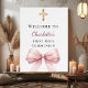 A large pink bow and a golden cross as decoration. Personalize and add her name.