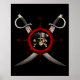 Crâne pirate, patchs oculaires, casquette pirate, os croisés pour un Jolly roger classique au centre d'un Rose de style vintage Compass avec deux épées de pirate croisées derrière.