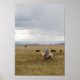 Ce magnifique tirage présente un cowboy sur un cheval de palomino fumé vérifiant le bétail, avec un magnifique paysage du Wyoming avec des montagnes et un ciel spectaculaire en arrière - plan.