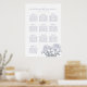 Dessin botanique de fleurs de chrysanthème bleu-gris et fleurs blanches pour plan de table de mariage 10. Modifiez ce plan de table pour 10 tables avec les noms de vos invités pour votre dîner formel assis de mariage. Parfait pour un mariage blanc, gris, vert et blanc, un mariage sur le thème floral de jardin, des fiançailles ou un anniversaire. Conception et peinture originale d'art abstrait moderne par Sarah Trett. www.sarahtrett.com pour www.mylittleedenweddings.com