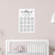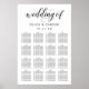 Affiche de plan de table de mariage moderne et chic noir et blanc avec un design typographique noir élégant et des accents de calligraphie gras et un texte personnalisé qui peut être personnalisé avec un monogramme des noms des mariés, noms des invités organisés par leur numéro de table attribué.