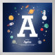 Joli poster monogramme personnalisé bleu marine avec les différents objets spatiaux. Vous pouvez facilement déplacer tous les objets (ou modifier la taille de la lettre) dans l'outil d'édition.
