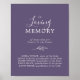 Ce panneau d'affiche minimaliste en prune de feuilles violet en mémoire d'amour est parfait pour un mariage élégant. Le design des tons de bijoux est composé d'une simple silhouette de feuilles verdoyantes dans un violet bleu foncé violet avec un style boho minimaliste.