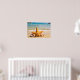 Une affiche avec une photo mignonne d'une étoile de mer dressée dans le sable. Sous ses bras se trouvent 2 petits coquillages reposant confortablement. Installé sur une plage aux vagues qui s'écrasent dans l'arrière - plan.