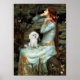 Ophelia (assise) de John W. Waterhouse (1898), adaptée pour inclure un jouet blanc ou un caniche miniature. Waterhouse a basé ce tableau sur l'Ophélie de Shakespeare.