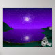 Un amas globulaire d'étoiles brillantes dans un ciel violet profond, réfléchi dans une baie, entouré d'un imaginaire / paysage autre-monde - art numérique, rendu dans Adobe Illustrator et Photoshop.