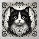 Illustration artistique en noir et blanc d'un chat entouré d'un complexe floral