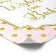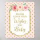 Voeux pour affiche pour bébé pour baby shower en rose clair et points dorés motif avec bordure or, rose rustique et des fleurs d'aquarelle pêche et des lettres de style manuscrit.
