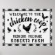 "Bienvenue au coop de poulet" texte avec 4 silhouettes de poulet (1 poule, 1 coq, 2 poulets/poussins), plus une couronne de feuilles et des oeufs. Ajoutez votre nom de famille à ce design rustique chic de ferme avec un cadre en plastique noir / blanc / gris et des silhouettes noires - parfait pour les fermiers et les amateurs de poulet.