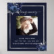 Un fond bleu foncé, un cadre argenté faux, des fleurs bleues et un espace pour une photo. Personnalisez et ajoutez le nom, les dates et votre texte.