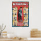 Ce poster vintage montre Harry Houdini avec plusieurs photos de ses mains en différents types de menottes. Il prétend que "rien sur terre ne peut tenir Houdini." Cette affiche est faite en rouge et jaune avec de grandes lettres blanches en gras.