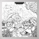 A heartwarming black-and-white illustration of sweet Newfoundland puppies enjoying a gentle rainy day. Playing and splashing in puddles, one holding an umbrella! The pups are surrounded by falling raindrops, capturing a playful and cozy moment. Beautifully detailed line art adds depth and texture, making this design perfect as a relaxing coloring page. The simple yet expressive scene invites you to bring it to life with your own creative colors. All art hand drawn by Notta Bear Newfoundlands (ww.nottabear.net)