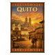 A vertical 2:3 travel poster of Quito, the capital of Ecuador, featuring the historic Old Town with its colonial architecture, ornate churches, and narrow cobblestone streets, the iconic Basilica del Voto Nacional rising prominently, surrounded by lush green Andean hills under a glowing sunrise sky, a few locals walking through the plaza to add life, subtle indigenous Ecuadorian patterns framing the composition, rich warm color palette with golden light and deep shadows, vintage retro travel poster style, soft grain texture, cinematic atmosphere, balanced composition, **with a captivating headline at the top reading “QUITO – Heart of the Andes” in elegant retro typography**