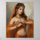 A digital art illustration of an elegant young oriental dancer in vibrant orange attire adorned with sparkling golden jewelry, rendered in a realistic, enchanting style that highlights grace and feminine beauty.