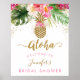 Chaque future mariée mérite une journée spéciale pour célébrer ! Accueillez vos invités à la fête de douche de la mariée avec un panneau personnalisé adorable. Encadrez le panneau et affichez-le sur une table près de l'entrée ou montez l'affiche sur mousse et affichez-la à l'extérieur sur un chevalet. Le design présente des fleurs aquarelles tropicales estivales avec des confettis pailletés dorés et un ananas pailleté doré. Le texte rose et or coordonné complète le magnifique design floral.