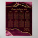 Welcome guests in style with this burgundy red and gold agate marble wedding seating chart, designed to make a striking statement at your reception. Rich jewel-toned reds, organic stone-inspired patterns, and luminous gold accents create a refined and dramatic display ideal for fall or winter weddings. The rich wine and crimson palette paired with metallic gold detailing complements elegant, modern, and glamorous celebrations while enhancing your décor. This seating chart is formatted for 8 tables and can be fully customized to accommodate additional tables, guest counts, and layout preferences, ensuring a seamless fit for your wedding day.