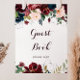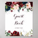 Ce panneau de livre d'or floral automnal illustré à l'aquarelle est parfait pour un mariage simple ou une fête de mariage. Le design présente des roses et des pivoines artistiquement peintes à la main à l'aquarelle bleu marine, bordeaux, rouge et rose pâle avec des feuilles vertes élégantes, inspirant la beauté automnale idyllique et colorée.