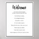 L'accueil apparaît dans un script noir en haut de cette affiche de règles de la maison pour une maison de location de courte durée. Une courte déclaration d'ouverture est sous le script. Ensuite, il y a huit règles pour une maison de location à court terme. Tout le texte est noir. Tout le texte peut être modifié pour refléter les règles uniques de votre location à court terme.