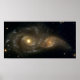 En direction de la constellation Canis Major, deux galaxies en spirale se croisent comme des navires majestueux la nuit. Le quasi-abordage a été capturé dans des images prises par le télescope spatial Hubble de la NASA et sa caméra planétaire à grand champ 2. La galaxie plus grande et plus massive est cataloguée comme NGC 2207 (à gauche dans l'image Héritage de Hubble), et la plus petite à droite est IC 2163. De fortes forces marémotrices de NGC 2207 ont déformé la forme de IC 2163, déplaçant les étoiles et le gaz dans de longs couloirs s'étendant sur cent mille années-lumière vers le bord droit de l'image. Des simulations informatiques, réalisées par une équipe dirigée par Bruce et Debra Elmegreen, démontrent l'échelle temporelle de temps tranquille sur laquelle se produisent les collisions galactiques. En plus des images de Hubble, les mesures effectuées avec le Télescope Radio Very Large Array de la Fondation nationale de la science au Nouveau-Mexique révèlent les mouvements des galaxies et aident à la reconstruction de la collision. Les calculs indiquent qu'IC 2163 a dépassé NGC 2207 dans le sens contraire des aiguilles d'une montre, après avoir fait son approche la plus proche il y a 40 millions d'années. Cependant, IC 2163 n'a pas assez d'énergie pour échapper à l'attraction gravitationnelle de NGC 2207, et est destiné à être retiré et balancer à nouveau au-delà de la galaxie plus grande à l'avenir. La haute résolution de l'image du télescope Hubble révèle des voies de poussière dans les bras en spirale de NGC 2207, clairement silhouetté contre IC 2163, qui est dans l'arrière - plan. Hubble révèle également une série de filaments de poussière parallèles s'étendant comme des coups de pinceau fin le long du matériau étiré dallement sur le côté droit. Les fortes concentrations de gaz et de poussière dans les deux galaxies pourraient bien éclater dans des régions de formation active d'étoiles dans un proche avenir. Piégées dans leur orbite mutuelle autour l'une de l'autre, ces deux galaxies continueront à se déformer et à se perturber mutuellement. A terme, dans des milliards d'années, ils se fonderont dans une galaxie unique, plus massive. On croit que de nombreuses galaxies d'aujourd'hui, dont la Voie Lactée, ont été assemblées à partir d'un processus similaire de coalescence de galaxies plus petites survenant sur des milliards d'années. Cette image a été créée à partir de 3 points séparés de Hubble. Debra Meloy Elmegreen (Vassar College), Bruce G. Elmegreen (IBM Research Division), Michele Kaufman (Ohio State U), Elias Brinks (Universidad de Guanajuato, Mexique), Curt Struck (Iowa State University), Magnus Thomasson (Onsala Space) , Suède), Maria Sundin (Université de Goteborg, Suède), et Mario Klaric (Colombie, Caroline du Sud).