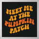 Cette conception comporte l'expression "Meet Me at the Citrouille Patch" affichée dans une police audacieuse d'inspiration rétro avec une apparence ludique et ondulée. Le texte est disposé en diagonale décalée, ajoutant une sensation dynamique et vivante au design. Le jeu de couleurs comprend des teintes automnales chaudes, avec les mots supérieurs dans un jaune doré passant à une orange riche vers le bas, créant un effet dégradé qui améliore le thème festif de l'automne.