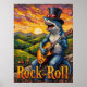 Ce tableau captivant présente un requin bleu "super", avec un chapeau haut et des lunettes de soleil rouges, engagé dans une "confiture d'or" sur une guitare électrique. Il se dresse sur un affleurement rocheux, surplombant un paysage de collines verdoyantes et d'arbres sous un ciel étonnant et texturé de coucher de soleil. La technique vibrante et impasto crée une atmosphère animée et exaltante, en transcendant parfaitement l'ambiance "ROCK and ROLL".