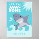 Joli décor mural pour chambres de garçons. Illustration d'un requin sortant de l'océan avec un sourire sur le visage. Il y a une marque de morsure dans le coin supérieur droit. Le texte ci-dessus dit "Tu es JAWSOME". Personnalisez ce produit en ajoutant le nom de votre enfant en bas du produit. Parfait pour une chambre ou une nurserie sur le thème nautique pour garçon.
