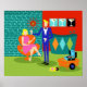 Cette Poster de couple Retro Martini ressemble à une scène d'une comédie romantique. Le cadre de ce style des années 60, design minimaliste, est une maison ou un appartement moderne élégamment décoré du milieu du siècle. La troupe est un couple séduisant qui profite d'une soirée remplie de conversations étincelantes, de bonne musique et de boissons sans fond. La salle est dotée d'un sol vert et d'un aqua et d'un mur turquoise en briques. Se reposant confortablement dans un mod, chaise d'oeuf orange est une belle femme. Sa robe rose vif est juste assez courte pour montrer ses jeux de forme. Avec la vague d'une main, cette beauté blonde a l'attention immédiate de son admirateur masculin. Son compagnon aux cheveux clairs porte un costume bleu, une chemise blanche et une cravate à arc noir. Dans ses mains, il tient deux lunettes de martini cristallin aux olives flottantes. Ne vous inquiétez pas. Il en offre une à sa copine. La paire a un temps si délicieux que ni l'un ni l'autre ne prend note de l'heure qui apparaît sur l'horloge kitschy, rouge, starburst sur le mur de brique derrière eux. Sur un mur rouge vif encastré, il y a trois Classic Movie Martini Stretched Canvas Prints, également disponible à la boutique Zazzle de StrangeLittleOnion (conseil, conseil!) Deux des tirages sont des arrière - plans turquoise et un est sur un arrière - plan noir dramatique. Un élégant bar humide est placé sous les empreintes. L'avant du bar turquoise présente trois diamants arlequins, dans les tons orange, turquoise et vert. On peut voir les silhouettes de lunettes à martini posées sur le comptoir. De l'autre côté de la pièce, un ottoman orange tient un lecteur de disques portable bleu et noir. Au sol, on voit les disques vinyles et une pochette d'album jaune vif. Ce duo séduisant est tellement délicieux que ni l'un ni l'autre ne prend note de l'heure qui apparaît sur l'horloge kitschy, rouge, starburst sur le mur de briques derrière eux.