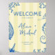 Seaside on the beach fun striped citrus yellow and blue playful unique wedding welcome sign printable poster featuring hand drawn starfish and ocean corals, and a chic whimsical handwritten calligraphy script. +++++++ All colors are editable. +++++++++ Suitable for retro casual trendy beach coastal summer destination weddings.