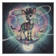Un hybride à cornes blanches se dresse sur une plate-forme en cristal flottant, habillé d'un chapeau fleuri et de bijoux en crâne. Derrière lui, des chevaux ailés squelettiques dérivent dans un ciel cosmique tourbillonnant rempli d'étoiles, de chauves-souris et d'engrenages flottants. Un visage de lune brillant regarde d'en bas, ajoutant du malheur à ce paysage gothique, de rêve steampunk. IA générée