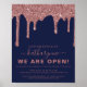 Chic Navy Blue Rose Gold Sparkle Parties scintillant Drips Business Ouvrir l'affiche avec nos gouttes de fausse parties scintillant tendance en or rose/rose et votre nom, nom d'entreprise ou logo. Parfait pour annoncer votre ouverture, réouverture, ou juste pour montrer votre esthétique de luxe. Le luxe est au rendez-vous, votre équipement devrait l'être aussi ! Veuillez nous contacter à cedarandstring@gmail.com si vous avez besoin d'aide pour la conception ou les produits correspondants.