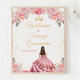Ce panneau d'accueil élégant et glamour Quinceañera présente une belle princesse aux cheveux foncés dans une robe de bal rose rose. Le texte combine écriture manuscrite et polices sans serif modernes pour un look élégant et sophistiqué. Les arrangements floraux et les confettis dorés créent un mélange parfait de rustique et de chic. Graphiques par www.etsy.com/uk/shop/SunflowerDayLove