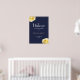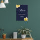 Ce panneau d'accueil mariage floral moderne et élégant présente de belles roses jaunes dans deux coins et une calligraphie blanche et pêche sophistiquée sur un arrière - plan bleu marine foncé. Le design a une bordure élégante. Personnalisez tout le texte sur l'affiche, les noms des mariés et des mariés et la date du mariage.