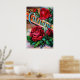 Un beau poster vintage avec une vieille image de carte de commerce avec de belles roses rouges.