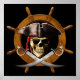 Aargh ! Crâne pirate, écusson, casquette pirate et épées croisées au-dessus de la roue d'un ancien bateau en bois.