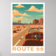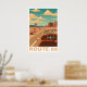 Hit the open road with this iconic Route 66 Travel Art Poster! Rendered in a nostalgic, graphic style, this piece captures the romance of the legendary "Main Street of America," featuring the endless desert highway, towering red mesas, and a classic convertible.