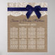 Le design comprend un bel arrière - plan rustique effet burlap avec une coupe en dentelle blanche vintage romantique finie par un magnifique ruban de marine avec arc. Ce tableau de sièges peut être personnalisé pour votre occasion spéciale et ferait le plan de table parfait pour tout mariage rustique, douche nuptiale, fête de fiançailles, fête d'anniversaire et bien plus encore. *Veuillez noter que Zazzle ne vend que des produits imprimés, de sorte que ce tableau de sièges n'a pas de matériel réel de burlap, dentelle, arc ou ruban.